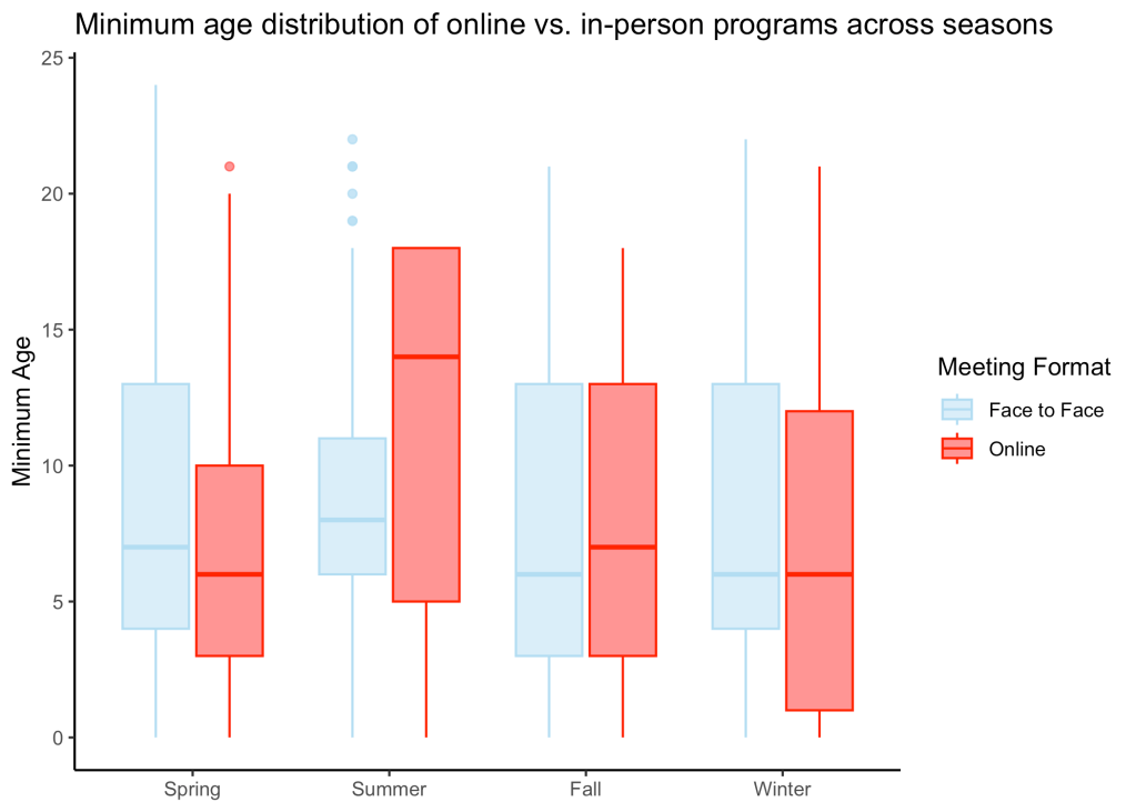 Since online programs technically serve all geographic regions of Chicago, we will separately analyze online programs and compare the results with those from in-person programs. However, we do acknowledge that the engagement and experiences vary between the different program types.