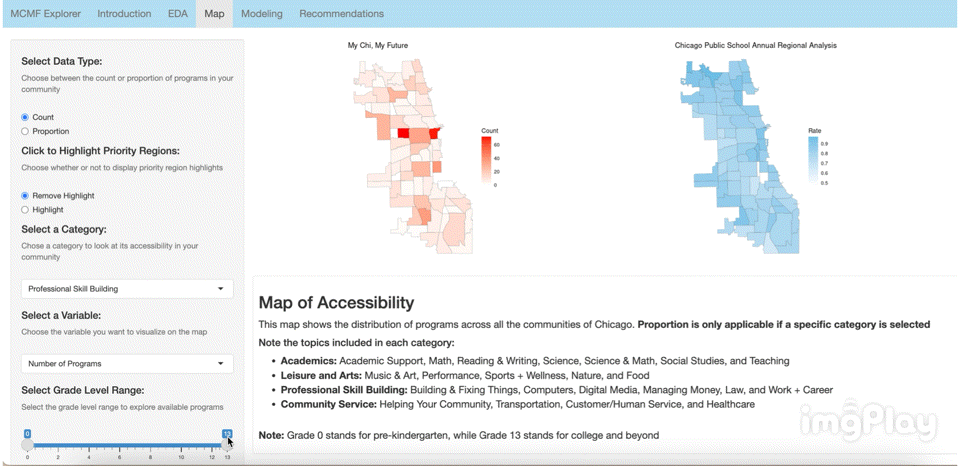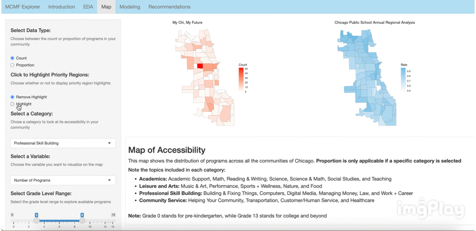 The interactive visual map allows the user to click through a variety of options to see how MCMF programs are distributed across Chicago’s communities. The following images show a few ways users can play around with the map.