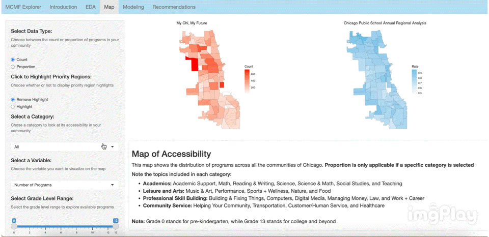 The goal of this project is to visualize the equity of opportunity for the City of Chicago’s youth to have access to and participate in local out-of-school programs across the city’s diverse neighborhoods and communities.